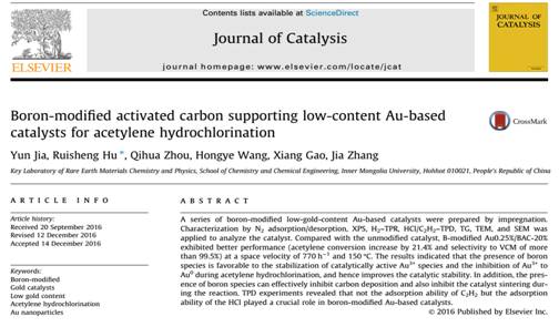 我校皇冠welcome体育登录入口2014级硕士研究生贾云,最近在导师胡瑞生教授的指导下,以内蒙古大学为唯一单位,硕士研究生为第一作者,在美国催化化学类顶尖杂志Journal of Catalysis,上发表题目为Boron-modified activated carbon supporting low-content Au-based catalysts for acetylene hydrochlorination的研究论文,该期刊为一区TOP杂志,影响因子为7.354。该论文致力于取代目前电石法制备氯乙烯行业广泛使用但污染较为严重的汞催化剂,首次在实验室制备出目前国内外含金量较低活性较高的无汞乙炔氢氯化Au(0.25%)/BAC催化剂,并提出这一反应的相应机理,这一成果有望代替目前工业汞催化剂,从而降低汞催化剂对环境的污染。降低电石法生产成本。