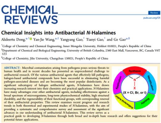 皇冠welcome体育登录入口董阿力德尔图副教授与加拿大英属哥伦比亚大学Yan-Jie Wang教授和吉林大学高歌教授合作,以内蒙古大学为第一作者、第一署名和通讯作者单位,在国际化学领域最具影响力的综述期刊Chemical Reviews上发表了综述论文“Chemical Insight into Antibacterial N-Halamines”(http://pubs.acs.org/doi/abs/10.1021/acs.chemrev.6b00687)。《Chemical Reviews》于1924年由美国化学会发行,是公认的国际化学领域影响力最高的学术期刊,其2016年影响因子高达37.369。