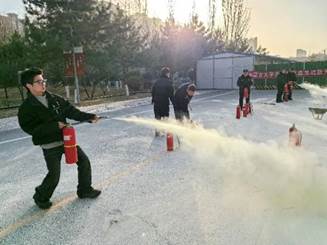 二、灭火器实际操作环节。在保卫处工作人员的带领下,同学们在卓越楼西侧亲身使用干粉灭火器灭火,能够正确掌握灭火器使用相关知识,确保在火灾发生时,每一位学生都能化身临时消防员,降低火灾进一步恶化风险。