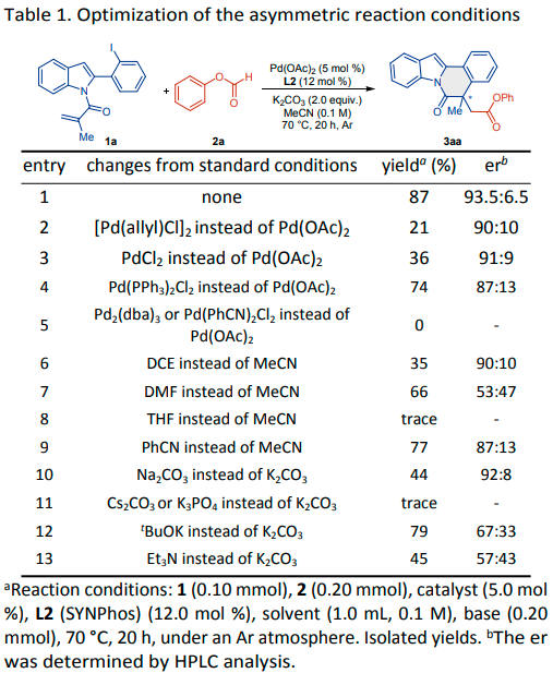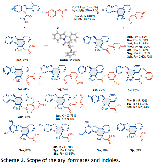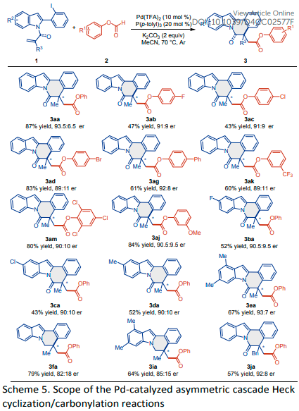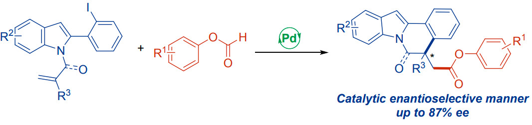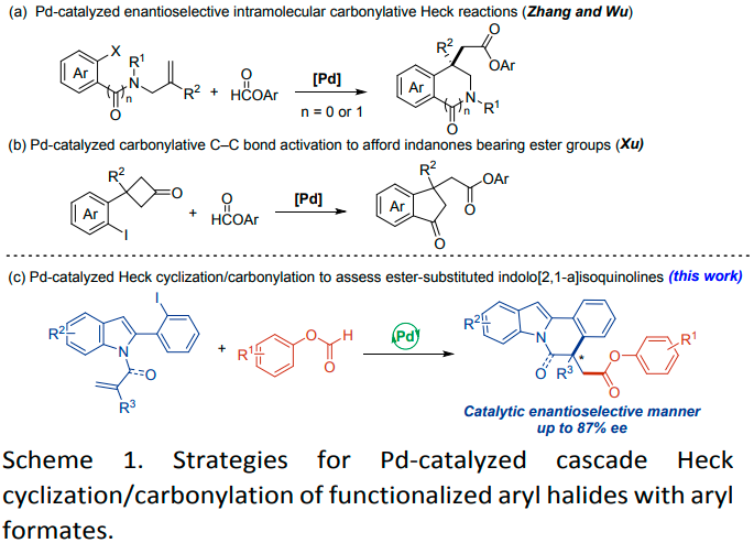另一方面,钯催化的羰基化策略已被证明是合成羰基化合物的一种强有力的方法。由于一氧化碳(CO)的毒性,已经开发了许多CO替代物,如TFBen、 Mo(CO)6、甲酸酯、和甲酸。沿着这一思路,使用甲酸酯作为羰基来源的钯催化级联羰基化取得了相当大的进展。例如,Zhang课题组开发了一种以甲酸芳基酯为羰基源的Pd催化的对映选择性分子内羰基化Heck反应,得到了一系列产率高、对映选择性高的3,4-二氢异喹啉季铵盐(Scheme 1a)(Chem. Sci. 2019, 10, 9853-9858)。随后,Wu课题组报道了氨基吡啶与酯组装官能化氮杂吲哚衍生物的Pd催化级联Heck环化/羰基化反应(Scheme 1a)(Chem. Commun. 2022, 58, 6825-6828)。2021年,Xu团队实现了含环丁酮的芳基碘化物与甲酸芳基酯的Pd催化羰基化C-C键活化,提供一系列带有酯基的茚酮(Scheme 1b)(Org. Chem. Front. 2021, 8, 3398-3403)。鉴于吲哚并[2,1-a]异喹啉及酯类衍生物的重要药理学特征,将有价值的酯基掺入吲哚并[2,1-a]异喹啉部分将是非常理想的,并可能为发现新的具有生物活性的潜在药物提供机会。随着作者对合成含氮杂环的持续兴趣(Chem. Commun. 2012, 48, 8012-8014),基于此,内蒙古大学陈树峰、王乐明团队报告了使用甲酸芳基酯作为CO源的吲哚Pd催化级联分子内Heck环化/羰基化反应,以提供一系列酯取代的吲哚并[2,1-a]异喹啉(Scheme 1c)。此外,通过使用手性膦配体也实现了不对称版本,从而以良好的产率和对映选择性得到吲哚并[2,1-a]异喹啉产物。