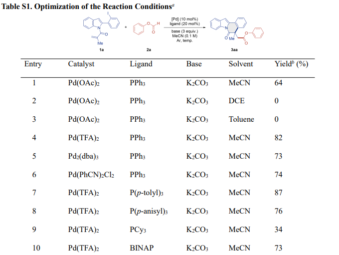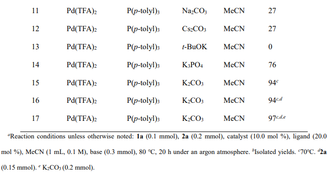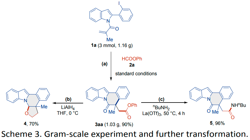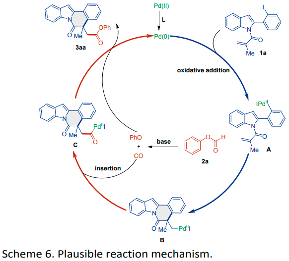 基于上述实验结果和文献中的报道,作者提出了可能反应机理。反应开始于钯(II)与膦配体反应生成活性的钯(0)复合物。钯(0)复合物与碘代吲哚发生氧化加成反应,形成芳基钯(II)中间体A。中间体A通过分子内Heck环化反应生成烷基钯(II)物种B。在碱存在下,由芳基甲酸酯释放的CO发生迁移插入,将中间体B转化为酰基钯(II)物种C。酚作为亲核试剂攻击中间体C,生成预期的产物3aa,并通过随后的还原消除再生活性钯(0)络合物。