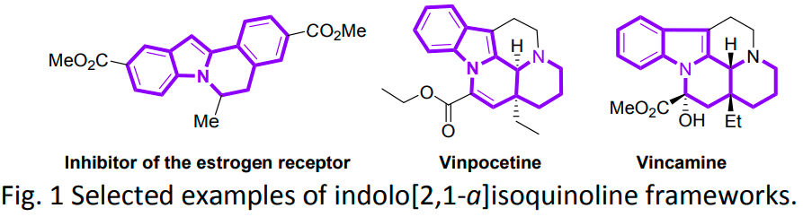 吲哚并[2,1-a]异喹啉骨架在许多生物活性分子和天然产物中是重要的结构单元,可以作为雌激素受体抑制剂、Vinpocetine和Vincamine等药物的核心骨架(Fig 1)。因此,关于构建吲哚并[2,1-a]异喹啉类化合物的方法引起了合成化学家和药物化学家的广泛关注。近年来,文献中报道了合成吲哚并[2,1-a]异喹啉骨架的各种策略。其中,过渡金属催化的环化和自由基环化级联方法得到了广泛的探索。尽管在这一领域取得了重要突破,但仍然需要开发方便有效的方法,直接获得高度官能化的吲哚并[2,1-a]异喹啉衍生物。