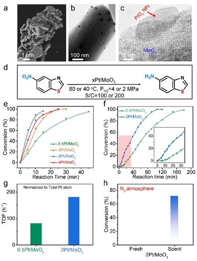 通过共沉淀-空气煅烧法制备的xPt/MoO3催化剂,具有PtOx NPs分布在片状结构的MoO3载体表面(图1a-c),Pt含量分别为0.5,1,2和4 wt%。将其应用在含硫化合物5-硝基苯并噻唑加氢反应中,当反应温度为80 ℃,氢气压力4 MPa,S/C=100(反应底物于Pt摩尔比)时(图d-e),所有金属含量的Pt/MoO3催化剂均具有优异的催化性能,其中2Pt/MoO3催化性能最优异,反应15 min转化率>99%, TOF 为1440 h-1。值得注意的是,当反应条件更温和时(40 ℃,2 MPa H2,S/C=200),2Pt/MoO3依然显示了优异的催化性能,不过其反应初期出现了明显的诱导期(图1f),表明催化剂在反应期间发生了结构演化且生成了活性位点。