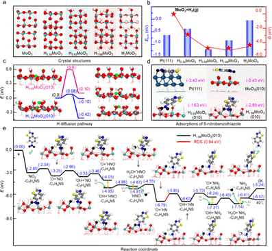为了更深入地解析实验结果,本研究采用密度泛函理论(DFT)对多种HxMoO3物相的稳定性,及其表面反应机理进行了详细研究。首先,通过计算确定了HxMoO3晶体的最稳定结构(图4a),进而计算了其在实验反应温度下的形成吉布斯自由能,结果发现H0.93MoO3为最稳定的物相,与实验数据一致。进一步的计算发现,HxMoO3晶体中的H原子结合能与其相转变之间存在直接关联(图4b),特别是H0.93MoO3与H1.68MoO3之间的可逆性转变。H原子在H1.68MoO3(010)表面上的迁移能垒计算(图4c),进一步证明其快速的氢溢流使得H1.68MoO3成为了一种高效的氢储存库,有助于氢的释放以促进加氢反应。吸附研究进一步显示(图4d),H1.68MoO3(010)表面更倾向于吸附5-硝基苯并噻唑的-NO₂端,有效避免了Pt表面的硫中毒。反应路径分析揭示(图4e),5-硝基苯并噻唑在H1.68MoO3(010)表面的加氢过程涉及N-O键解离形成表面*O和氢迁移脱除*O,并确定了通过H扩散在氧空位上脱除第二个*O原子形成*OH的过程为速率决定步骤,其势垒为0.94 eV。综上所述,由于H1.68MoO3(010)独特的H质子储存和释放性能,不仅促进了5-硝基苯并噻唑氢化过程中N-O键的断裂,而且有效防止了Pt的硫中毒,为开发更高效的催化剂和优化有机化合物氢化反应路径提供了新的见解。