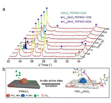 原位XRD表征结果显示,Pt/MoO3在氢气气氛下会解离氢并通过氢溢流将活性H物种储存到MoO3体相中形成H1.68MoO3(图3),再次证明原位形成的H1.68MoO3是催化反应发生的活性物种。