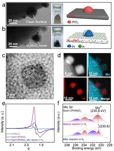 对反应后的最优催化剂2Pt/MoO3(命名为spent 2Pt/MoO3)进行表征后发现Pt NPs表面被覆盖(图2a-b),HRTEM,HAADF-STEM,EPR和XPS结果显示该物质为HxMoO3物种(图2c-f)。除此之外,将spent 2Pt/MoO3在氮气气氛下催化5-硝基苯并噻唑进行催化反应12 h(40 ℃,2 MPa N2, S/C=10)后成功得到了71.2%转化率,而新鲜2Pt/MoO3催化剂却不能在氮气气氛下发生催化反应(图1h)。该结果进一步证明在反应过程中原位生成的HxMoO3为活性物种且可以作为H源。