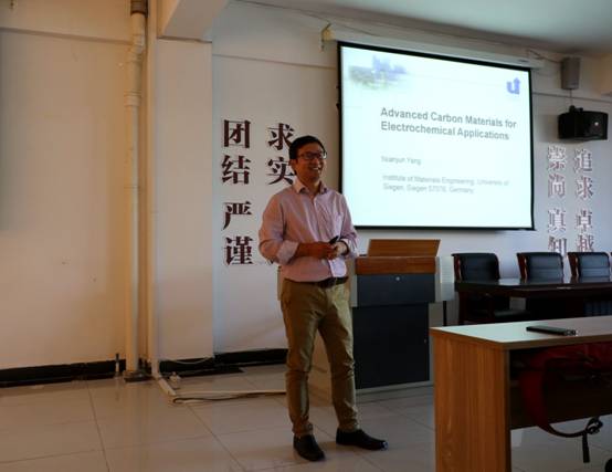 2018年9月18日,德国锡根大学材料工程研究所杨年俊高级研究员访问我校皇冠welcome体育登录入口,并在桃李学术论坛作了题为“Advanced carbon materials for electrochemical energy storage and conversion”的专题报告。报告会由褚海斌教授主持,皇冠welcome体育登录入口院长张军教授、胡瑞生教授、谷晓俊教授、王勤教授等十多位教师与研究生参加了报告会。杨年俊研究员系统介绍了他们课题组近十年来在金刚石、碳纤维等碳材料的制备及其在电化学传感、能量存储、电催化等应用领域的研究工作。在场师生被杨老师特色鲜明、层层深入的报告吸引,在报告之后纷纷提问,与杨年俊研究员进行了深入的讨论。
