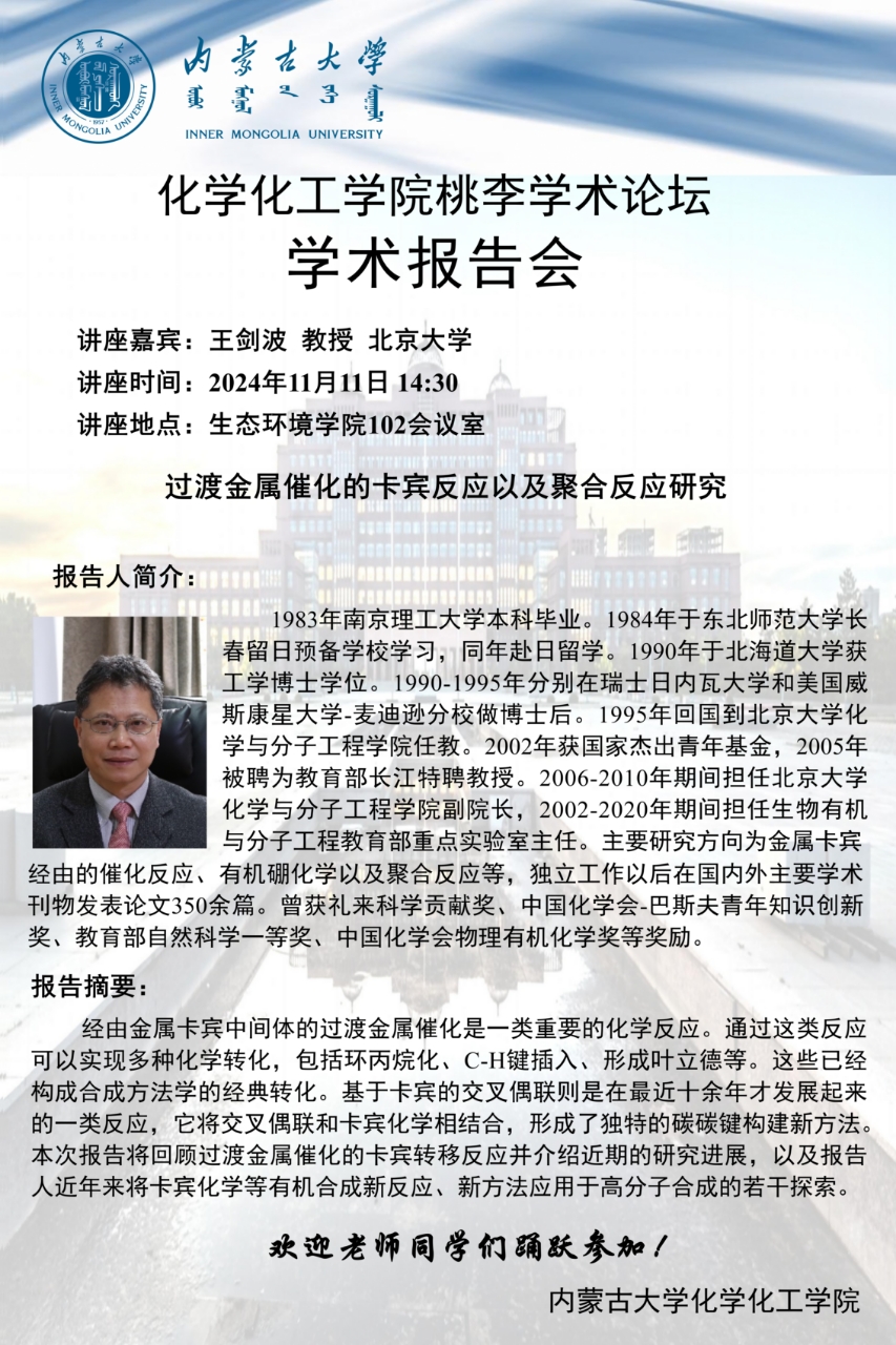 皇冠welcome体育登录入口桃李学术论坛——过渡金属催化的卡宾反应以及聚合反应研究 王剑波 教授 北京大学