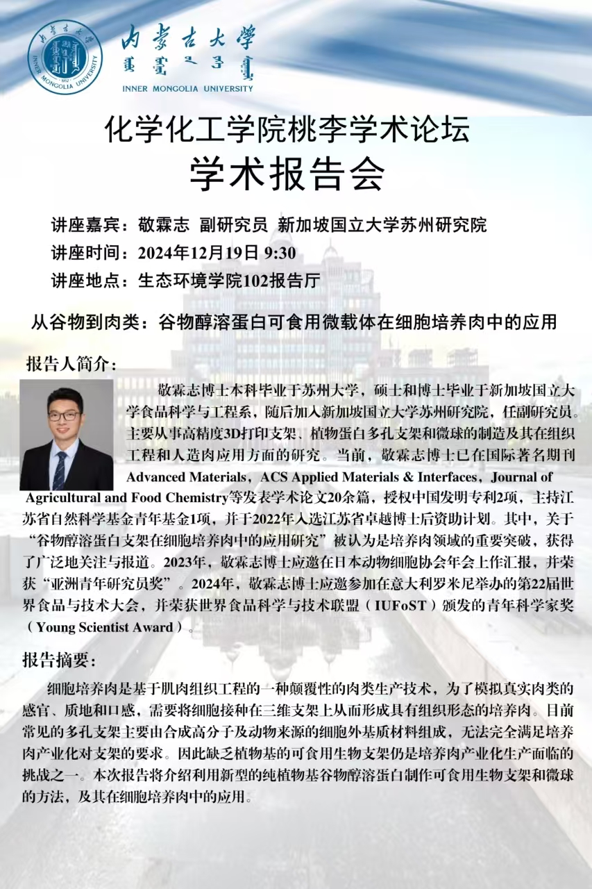 皇冠welcome体育登录入口桃李学术论坛——从谷物到肉类:谷物醇溶蛋白可食用微载体在细胞培养肉中的应用 敬霖志 副研究员 新加坡国立大学苏州研究院